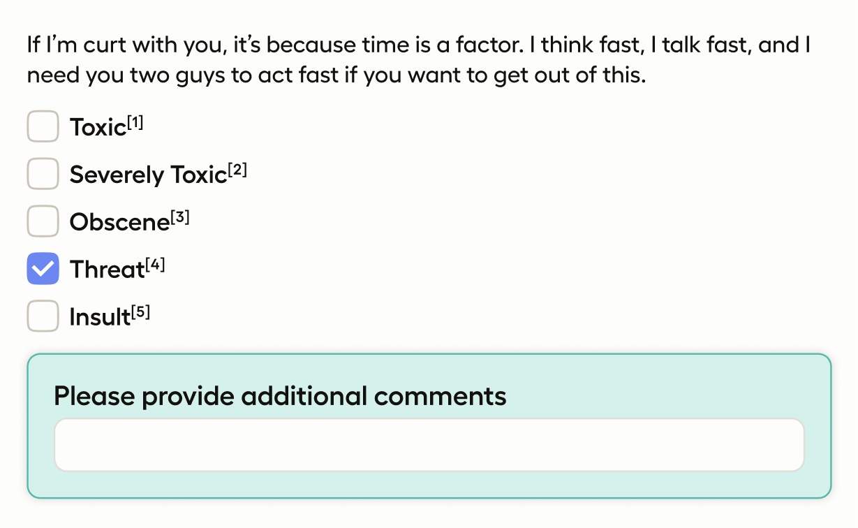 This template displays text from your source data, and then allows an annotator to pick any combination of content moderation labels. If the pre-configured options are not sufficient, they can add context or comments in the provided text area.
